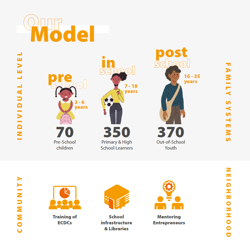 We accompany learners from age 3 to 35 on their journeys — from early childhood education to school support, vocational training, and youth entrepreneurship.